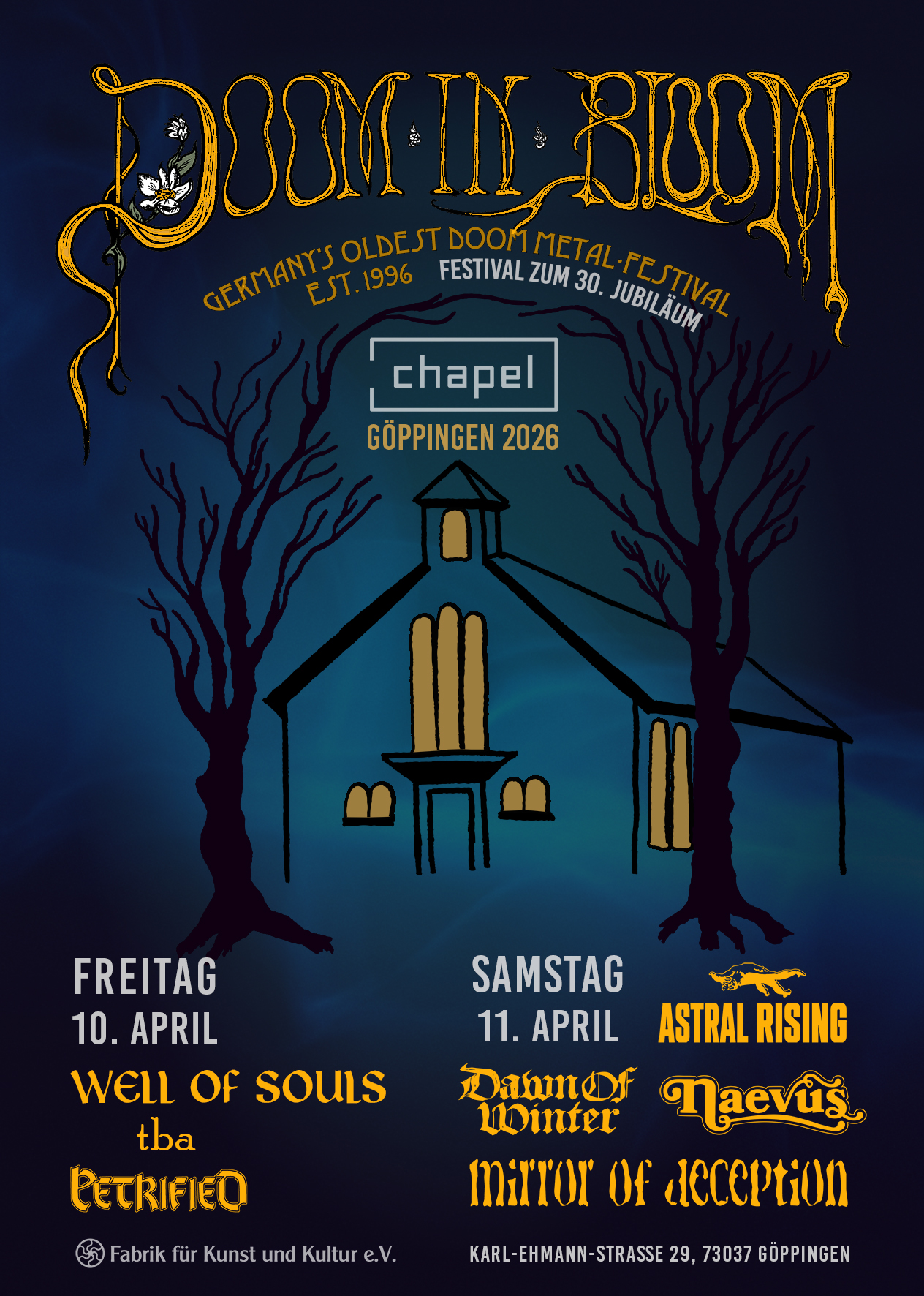 Alle Bands der Erstausgabe sind noch immer aktiv und teilen sich 30 Jahre später abermals die Bühne, und zwar in der altehrwürdigen Chapel zu Göppingen (Karl-Ehmannstr. 29), wo einst das legendäre Doom Shall Rise stattfand.
